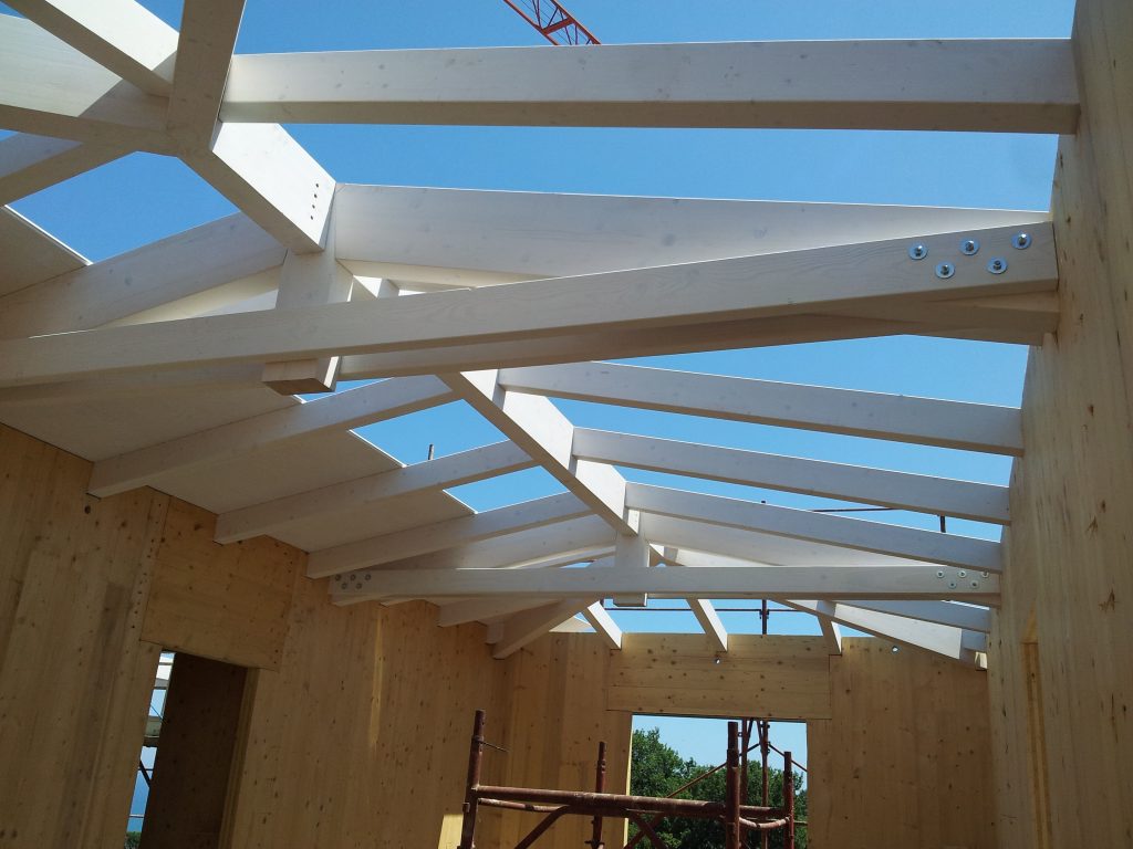 Questa struttura realizzata con tecnologia in Xlam con cappotto in fibra di legno e copertura ventilata rispetta elevati standard termici.